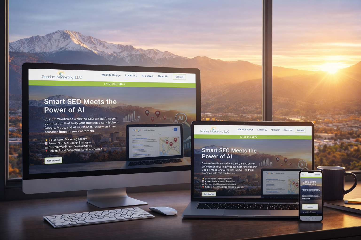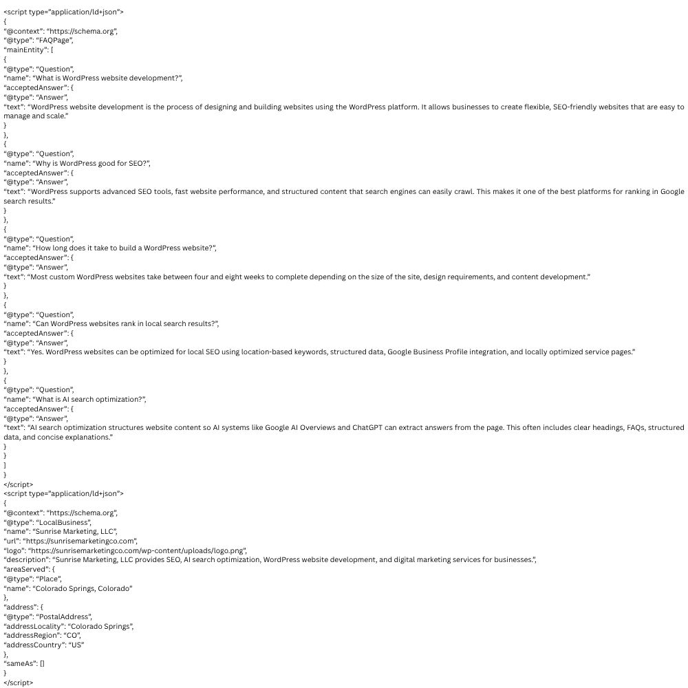 At Sunrise Marketing, LLC, we build high-performance WordPress websites designed to rank in Google, local search, and AI-powered answer engines. Our websites combine modern design, advanced technical SEO, and AI-optimized content structures so your business gets found by customers searching online.